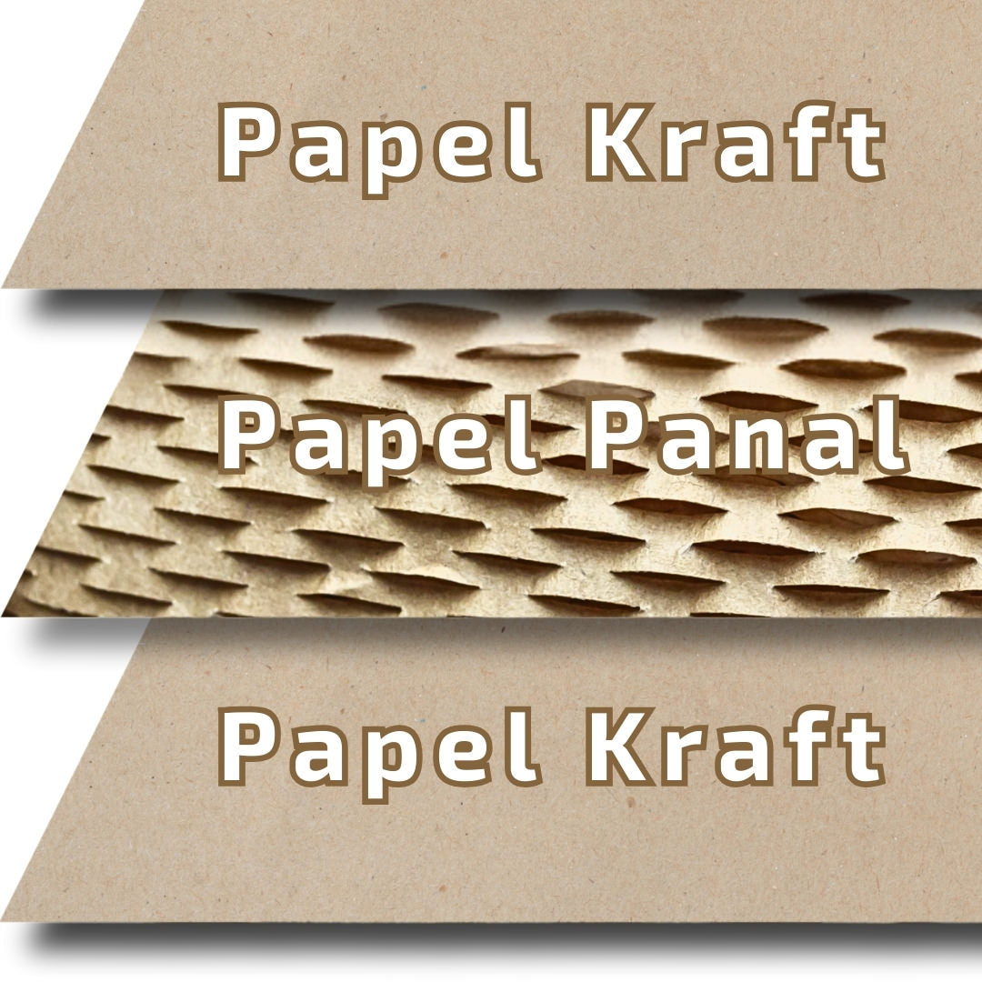 Esta estructura va entre tres capas de papel kraft: las dos externas funcionan como recubrimiento protector, y la capa intermedia —la del panal— es la que aporta la resistencia estructural.